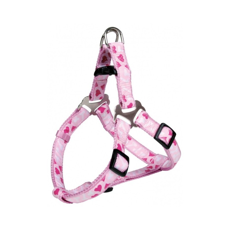 De nylon hondentuig voor is volledig verstelbaar op de borst en buik met tekeningen van harten en botten. Makkelijk aan te kleden.